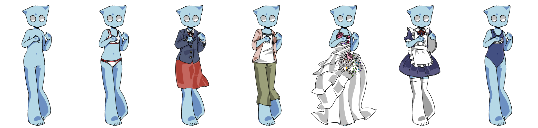 左から全裸、下着、制服、私服、ウエディングドレス、メイド服、スク水です